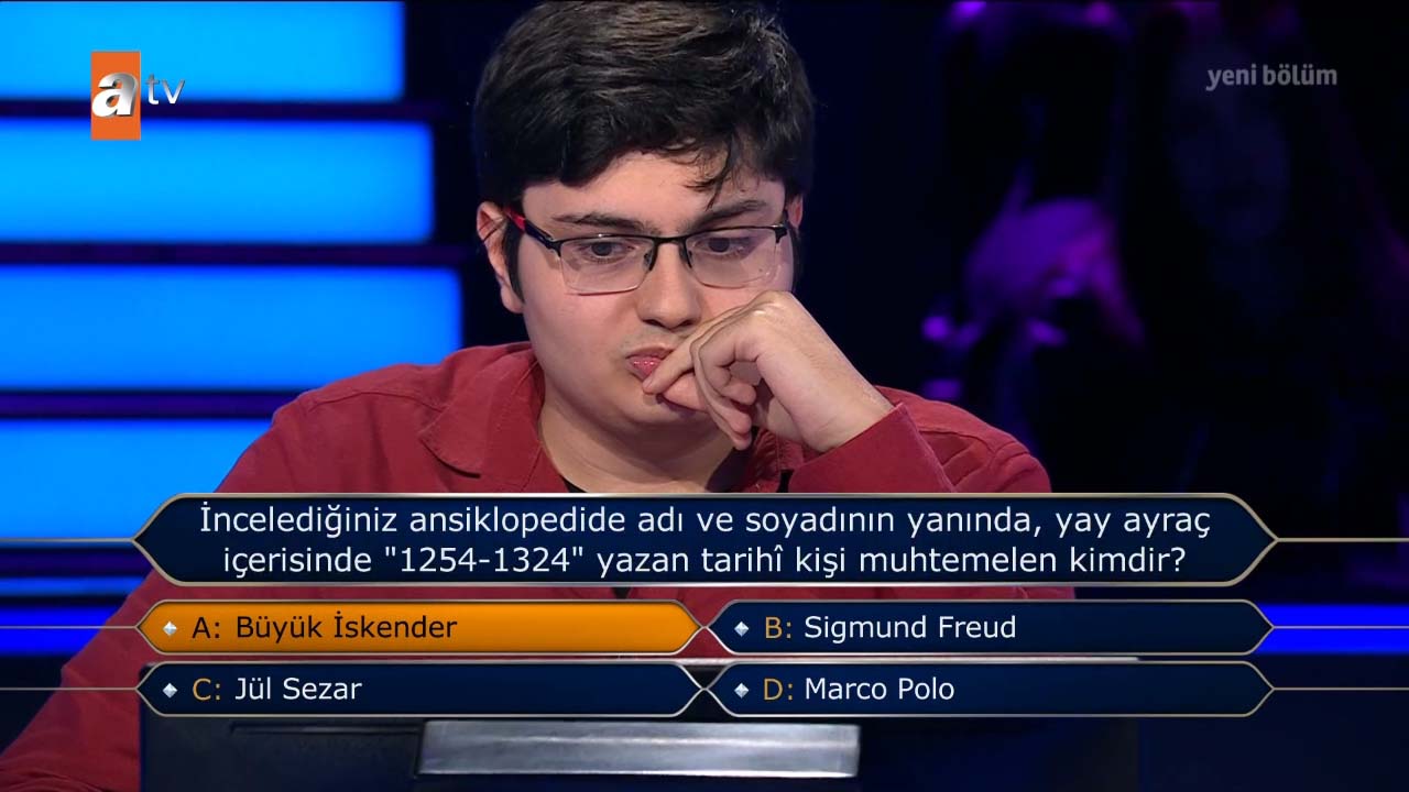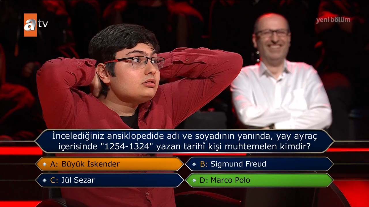 Milyoner'de, genç yarışmacıya 30 bin TL değerinde "İncelediğiniz ansiklopedide adı ve soyadının yanında, yay ayraç içerisinde "1254-1324" yazan tarihi kişi muhtemelen kimdir?" sorusu yönetildi.