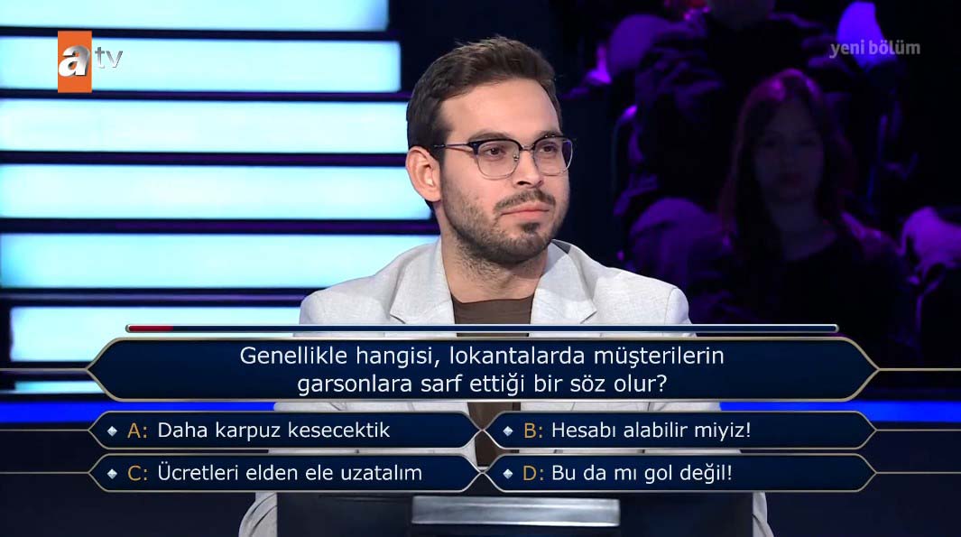ATV'nin beğeniyle izlenen ve reytingleri altüst eden programlarından Kim Milyoner Olmak İster, her hafta olduğu gibi bu hafta da izleyicileri ekran başına kilitledi. Milyoner'de bu hafta başarılı performanslar yer alırken programda kahkaha dolu anlar da yaşandı. Yarışmaya İstanbul'dan katılan ve avukat olan Serhat Şimşek isimli 29 yaşındaki yarışmacının o sözleri Kim Milyoner Olmak İster'e damga vurdu. Ünlü sunucu Oktay Kaynarca ise o anlarda şaştı kaldı. İşte o detaylar...