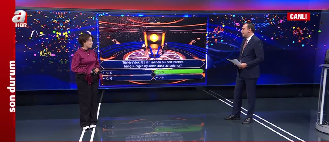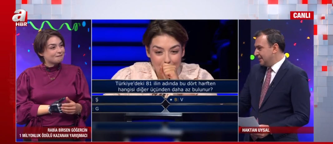 ATV ekranlarının sevilen bilgi yarışması, reyting rekortmeni Kim Milyoner Olmak İster yine izleyenleri ekranlara kilitlerken, Rabia Birsen Göğercin isimli yarışmacı milyonluk soruya ulaştı. Kenan İmirzalıoğlu'nun da başarısından ötürü takdir ederek alnından öptüğü yarışmacı, 1 milyonluk soruda doğru cevabı verdi. Büyük ödülü nasıl kazandı? Neler yaşadı? Eline ne oldu? Yarışmaya damga vuran Rabia Birsen Göğercin, A Haber canlı yayınında duygularını anlatıyor. İşte Kim Milyoner Olmak İster'de 1 milyonluk soru...