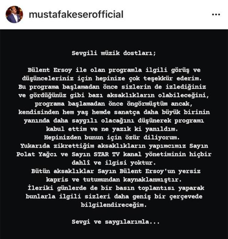 "Sevgili müzik dostları; Bülent Ersoy ile olan programla ilgili görüş ve düşünceleriniz için hepinize çok teşekkür ederim. Bu programa başlamadan önce sizlerin de izlediğiniz ve gördüğünüz gibi bazı aksaklıkların olabileceğini, programa başlamadan önce öngörmüştüm ancak, kendisinden hem yaş hem de sanatça daha büyük birinin yanında daha saygılı olacağını düşünerek programı kabul ettim.