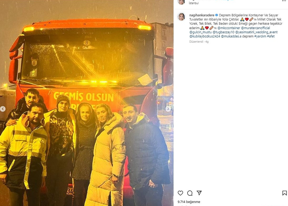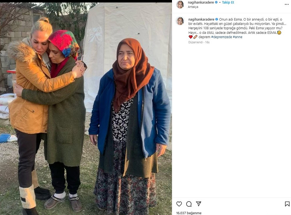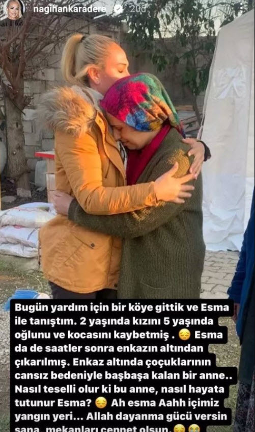 Survivor'la ünlenen Nagihan Karadere; Hatay, Kahramanmaraş, Şanlıurfa, Gaziantep, Mersin, Osmaniye ve Adana gibi pek çok şehri yasa boğan deprem felaketi sonrası afet bölgesine gitmişti.