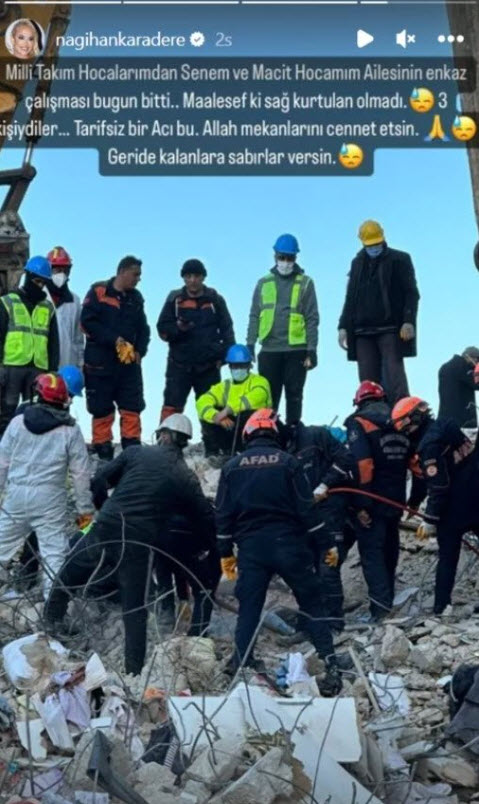 Tüm Türkiye'nin yüreğini yakan deprem felaketinin ardından kolları sıvayan isimlerden biri de Survivor yarışmasıyla tanınan Nagihan Karadere olmuştu. Soluğu deprem bölgesinde alan Nagihan Karadere ölüm haberini, "Tarifsiz bir acı bu" sözleriyle sosyal medya üzerinden duyurdu.