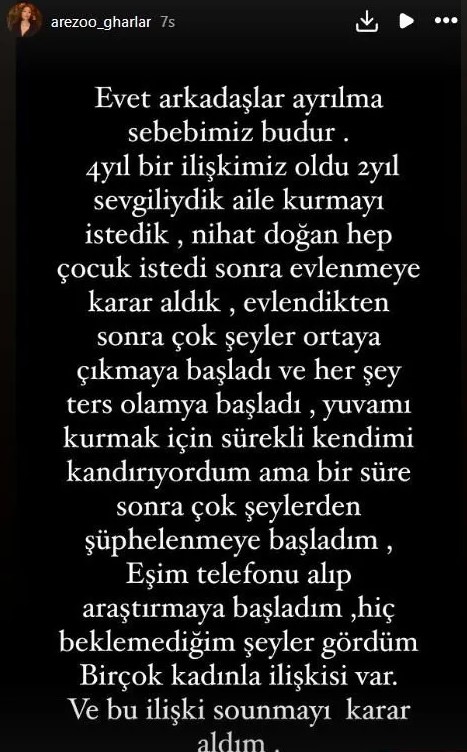 Nihat Doğan ve Arzu Doğan, boşanma kararı aldı. Boşanma nedeni ise 'kıskançlık krizi' olarak gösterildi. Ancak Arzu Doğan, sosyal medya hesabında yaptığı paylaşımla ayrılığın nedeninin bambaşka olduğunu açıkladı.