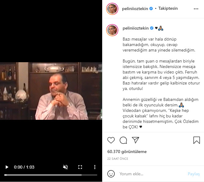 "Bugün, tam şu an o mesajlardan biriyle istemsizce bakıştık. Nedensizce mesaja bastım ve karşıma bu video çıktı. Ferruh abi çekmiş, sanırım 4 veya 5 yaşımdayım. Bazı hatıralar vardır gelip kalbinize oturur ya, oturdu!"