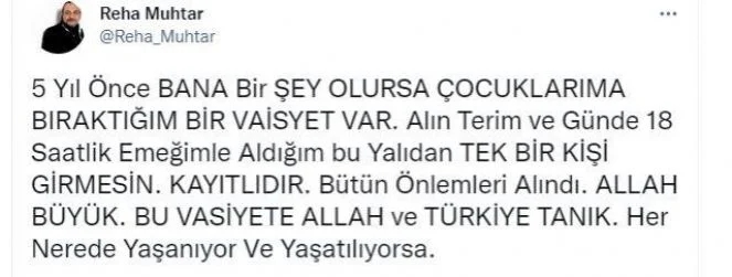 "5 yıl önce bana bir şey olursa çocuklarıma bıraktığım bir vasiyet var. Alın terim ve günde 18 saatlik emeğimle aldığım yalıdan tek bir kişi girmesin. Kayıtlıdır. Bütün önlemleri alındı. Allah büyük, bu vasiyete Allah ve Türkiye tanık. Her nerede ve nasıl yaşatılıyorsanız"