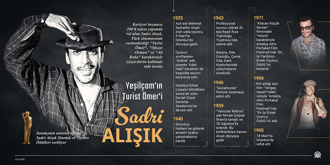 "Turist Ömer", "Küçük Hanımefendi", "Ayşecik", "Kartallar Yüksekten Uçar" ve "Çalıkuşu"nun da aralarında bulunduğu 200'ün üzerinde film ve dizide rol alan, komedyen, yönetmen, şair ve ressam Sadri Alışık, doğumunun 100. yılında kabri başında düzenlenen törenle yad edildi.