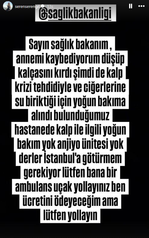 Instagram hesabından konuyla ilgili paylaşım yapan Serengil, "Annemi yoğun bakıma kaldırdık. Dualarınızı bekliyorum" notunu düştü.