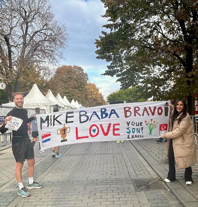 Karsu, koşuyu bitiren eşini "Mike baba tebrikler. Sevgiler oğlun ve Karsu" yazılı pankartla karşıladı.