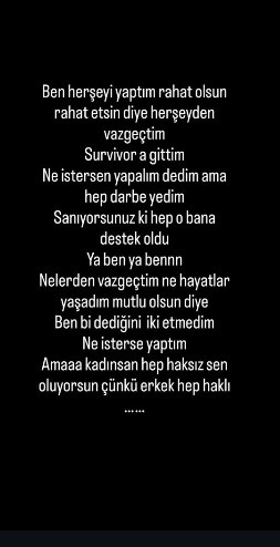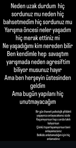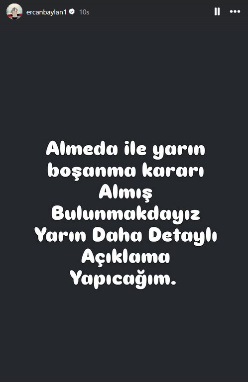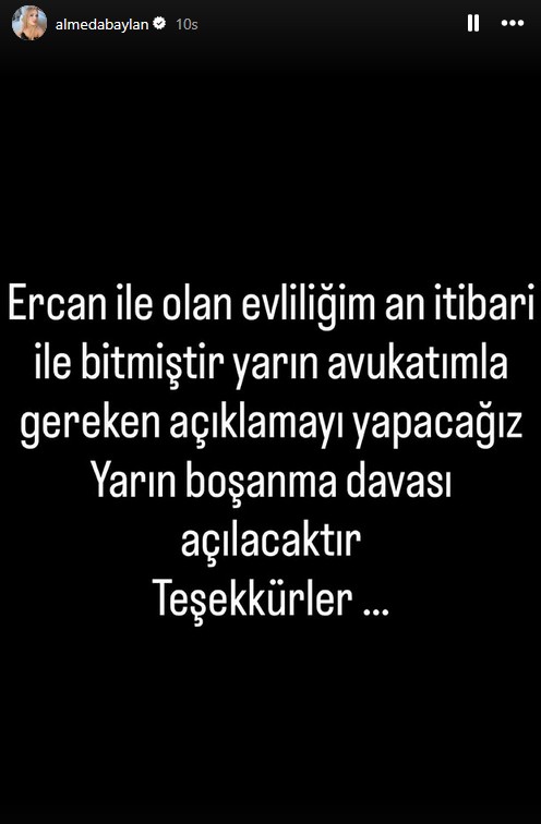 ''Arkadaşlar merhaba. Sürekli DM'de veya yorumlarda eşimden bahsediliyor. Eşin niye yanında yok, eşinden boşanacak mısın? Arkadaşlar siz beni tanıdınız, eşimi tanımadınız. Ben bu arada boşanacaksam da böyle bir açıklama yapardım. İnsanların özel hayatı var ya. Bu benim özel hayatım. Ben eşimle tanınmadım, yalnız tanındım. Eşim zaten benim yanımda. Lütfen herkes kendi hayatına baksın, kendi hayatıyla ilgilensin. Bir açıklama getirmek istedim. Ben belli bir yaşta insanım. Bir yerlere yalnız gidebilirim. Benim bir evcil hayvanım var, eşimin evde kalıp onunla ilgilenmesi lazım. Bu eş muhabbeti çok sıktı. Zaten gerektiği yerde tatile birlikte gidiyoruz. Ben bunun çok samimi olduğunu düşünmüyorum. Özel hayatımda, özel kararlarımda ne istersem onu yaparım. Biraz anlayış istiyorum lütfen. Bu şekil bir baskı hiç hoş değil. Sadece bunu belirtmek istedim.''