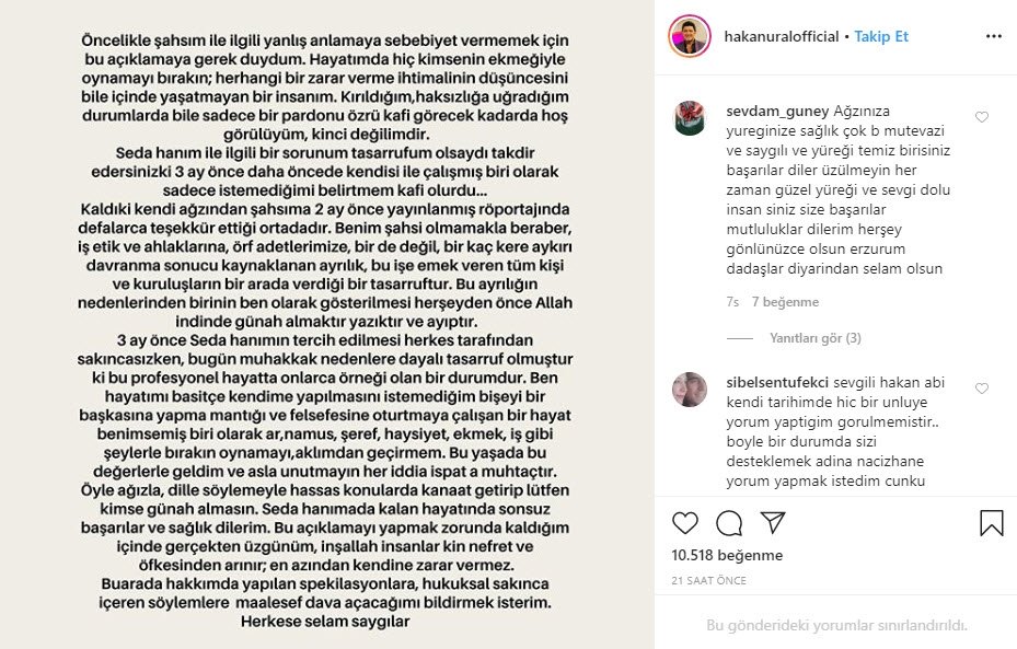 Ural açıklamasında "İş etik ve ahlaklarına, örf adetlerimize, bir de değil birkaç kere aykırı davranma sonucu kaynaklanan ayrılık bu işe emek veren tüm kişi ve kuruluşların bir arada verdiği tasarruftur" dedi.