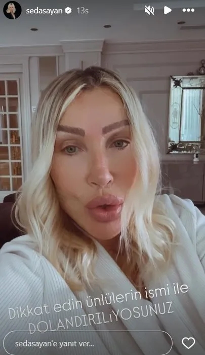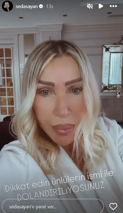 Son günlerde artan dolandırıcılık suçlarına karşı 3,2 milyon takipçilik hesabında açıklama yapan ve uyarıda bulunan Sayan şu ifadeleri kullandı: ''Son zamanlarda benim adımı kullanıp dolandırıldık yapıyorlar. En son doktorumu dolandırmaya kalkmışlar. Allah'tan hemen bana ulaştı. Şimdi de biraz önce telefonu kapattım o yüzden bu videoyu çekiyorum.