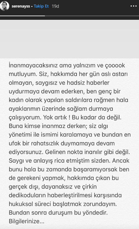 Serenay Sarıkaya tüm bu iddiaların ardından Instagram hesabında isyan bayrağını açtı.