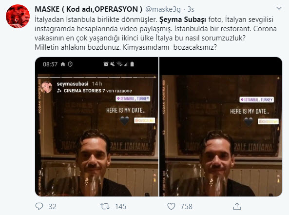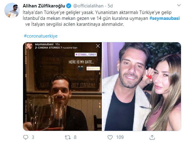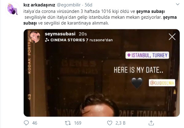 Şeyma Subaşı'nın uzun bir süredir birlikte olduğu sevgilisi Guido Senia, İtalya'dan Türkiye'ye geldi. İtalya'da direkt uçuş olmadığı için Yunanistan üzerinden geldiğini söyleyen Guido Senia tepkilere neden oldu. Corona virüsü nedeniyle yurt dışı seyahatlerinden sonra uyulması gereken 14 gün karantinada kalma kuralına uymayan Guido Senia ve Şeyma Subaşı'nın sorumsuzluğu tepki topladı. Corona virüsü taşıma riski bulunan Senia hakkında İçişleri Bakanlığı harekete geçti.