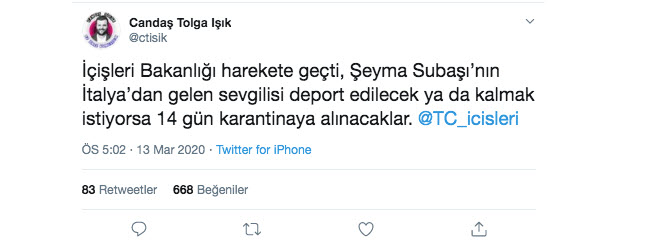 Gazeteci Candaş Tolga Işık, Şeyma Subaşı ve sevgilisi Gudio Senia için İçişleri Başkanlığı'nın harekete geçtiğini şu paylaşımla duyurdu: