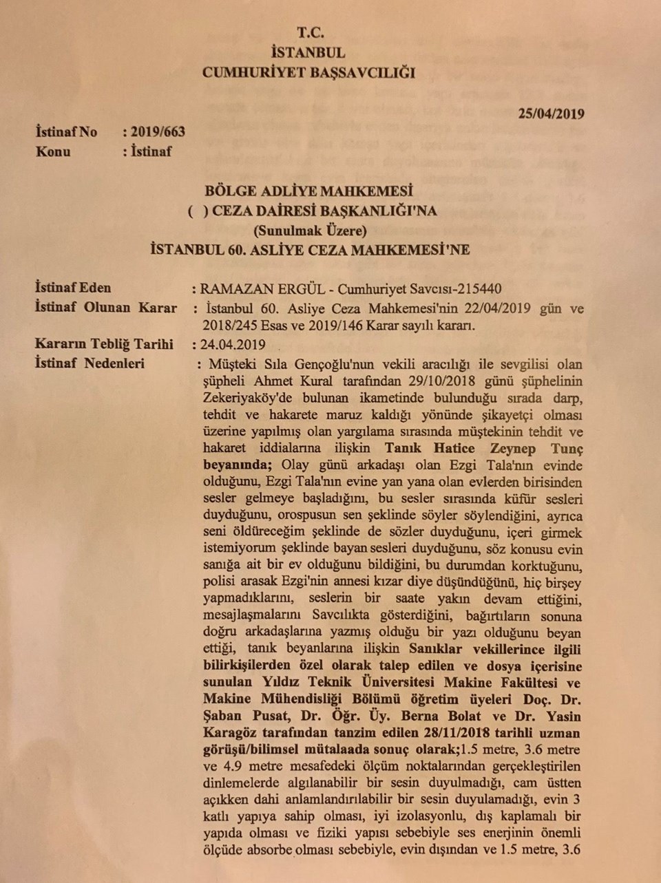 Savcılıktan yapılan itirazda, "Sanıklar vekillerin ve ilgili bilirkişiden özel olarak talep edilen ve dosya içerisine sunulan Yıldız Teknik Üniversitesi Makine Fakültesi ve Makine Mühendisliği Bölümü öğretim üyeleri Doç. Dr, Şaban Pusat, Dr. Öğr. Üy. Berna Bolat ve Dr. Yasin Karagöz tarafından tanzim edilen 28/11/2018 tarihli uzman görüşü/bilimsel mütalaada sonuç olarak; 1.5 metro, 3.6 ve 4.9 metre mesafedeki ölçüm noktalarından gerçekleştirilen dinlemelerde algılanabilir bir sesin duyulmadığı, cam üstten açıkken dahi anlamlandırılabilir bir sesin duyulmadığı, evin 3 katlı yapıya sahip olması, iyi izolasyonlu, doış kaplamalı bir yapıda olması ve fiziki yapısı sebebiyle ses enerjinin önemli ölçüde absorbe olması sebebiyle, evin dışından ve 1,5 metre, 3,6 metre ve 4,9 metre mesafeden dahi algılanabilir bir sesin duyulmasının oldukça güç olduğu" ifadelerine yer verildi.