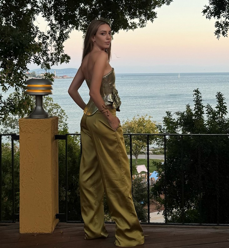 Saten bir pantolon ve ona uyumlu straplez bluz giyen Kobal partiden kareleri sosyal medya hesabında takipçileriyle de paylaştı.