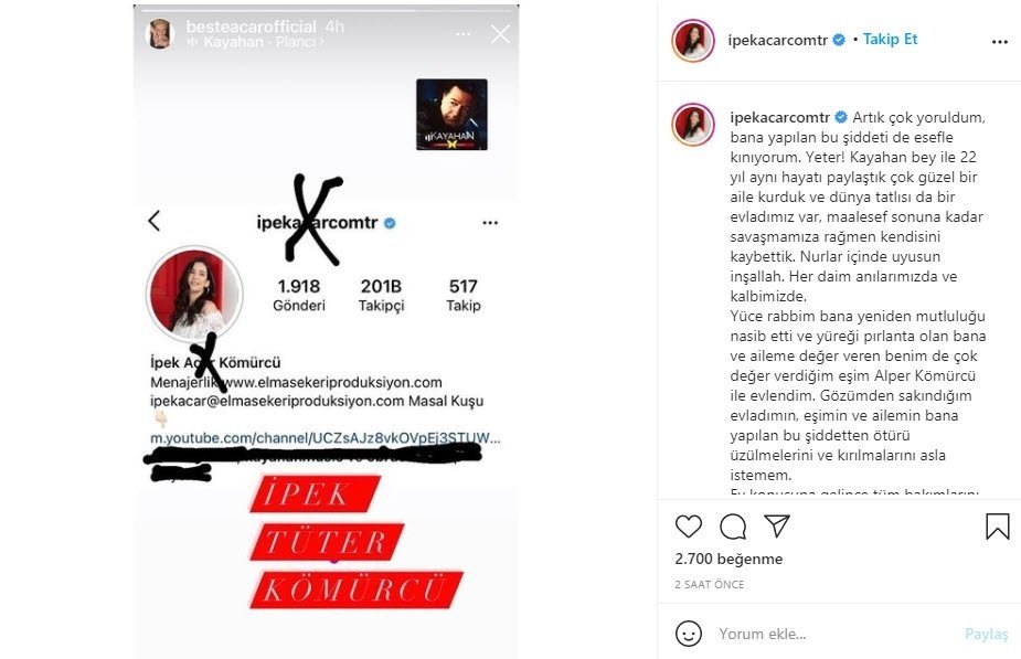 2015 yılında hayatını kaybeden usta sanatçı Kayahan'ın kızı Beste Açar, İpek Açar'ın başkasıyla evlenmesine rağmen babasının soyadını kullanmasına isyan etti. Bu açıklama sonrası sessizliğini bozan İpek Açar, 'Artık çok yoruldum, bana yapılan bu şiddeti de esefle kınıyorum' cevabını verdi. İpek Açar kızıyla aynı soyadını kullanmaya devam edeceğini söylerken Açar'ın eşi Alper Kömürcü, konuyla ilgili ilk kez konuştu.