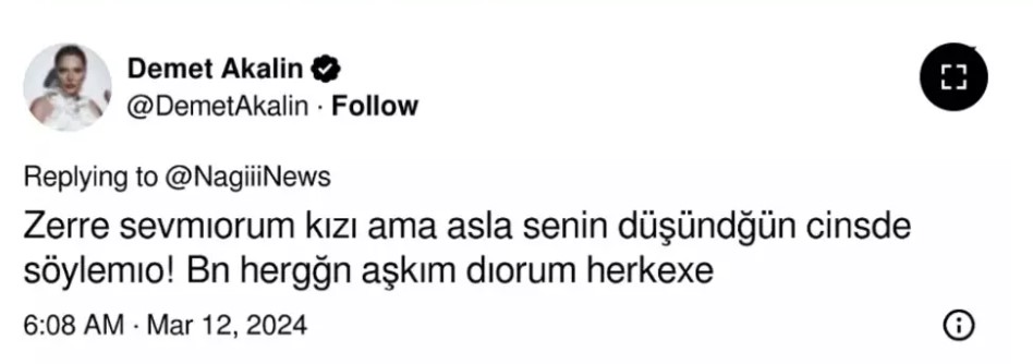 Aleyna Kalaycıoğlu'ndan pek haz etmeyen Akalın, yine yorumsuz kalamadı ve soluğu Twitter'da aldı. Konuyla ilgili yorum yapan şarkıcı, "Zerre sevmiyorum kızı ama asla senin düşündüğün cinste söylemiyor. Ben her gün aşkım diyorum herkese" ifadelerini kullandı.