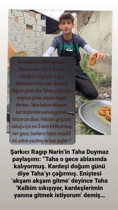 Kısıtlı imkanlarla çektiği videolarla fenomen olan Taha Duymaz Kahramanmaraş merkezli depremde enkaz altında kalmıştı. Günlerdir umutlu bekleyiş sürerken depremin 12. gününde acı haber geldi. Taha Duymaz'ın ölüm haberi sonrası sosyal medya fenomenleri veda paylaşımında bulundu. Taha Duymaz ile anılarını paylaşan fenomenler hüzünlendirdi... İşte sosyal medya fenomenlerinin Taha Duymaz'a vedası...