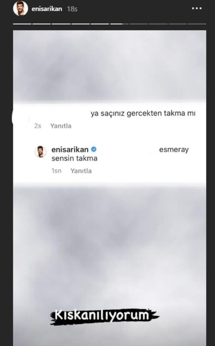 Arıkan, takipçisinin 'Ya saçınız gerçekten takma mı?' sorusunu karşılık olarak 'Sensin takma. Kıskanılıyorum' notunu yazdı. Enis Arıkan'ın esprili cevabı hayranlarını güldürdü.