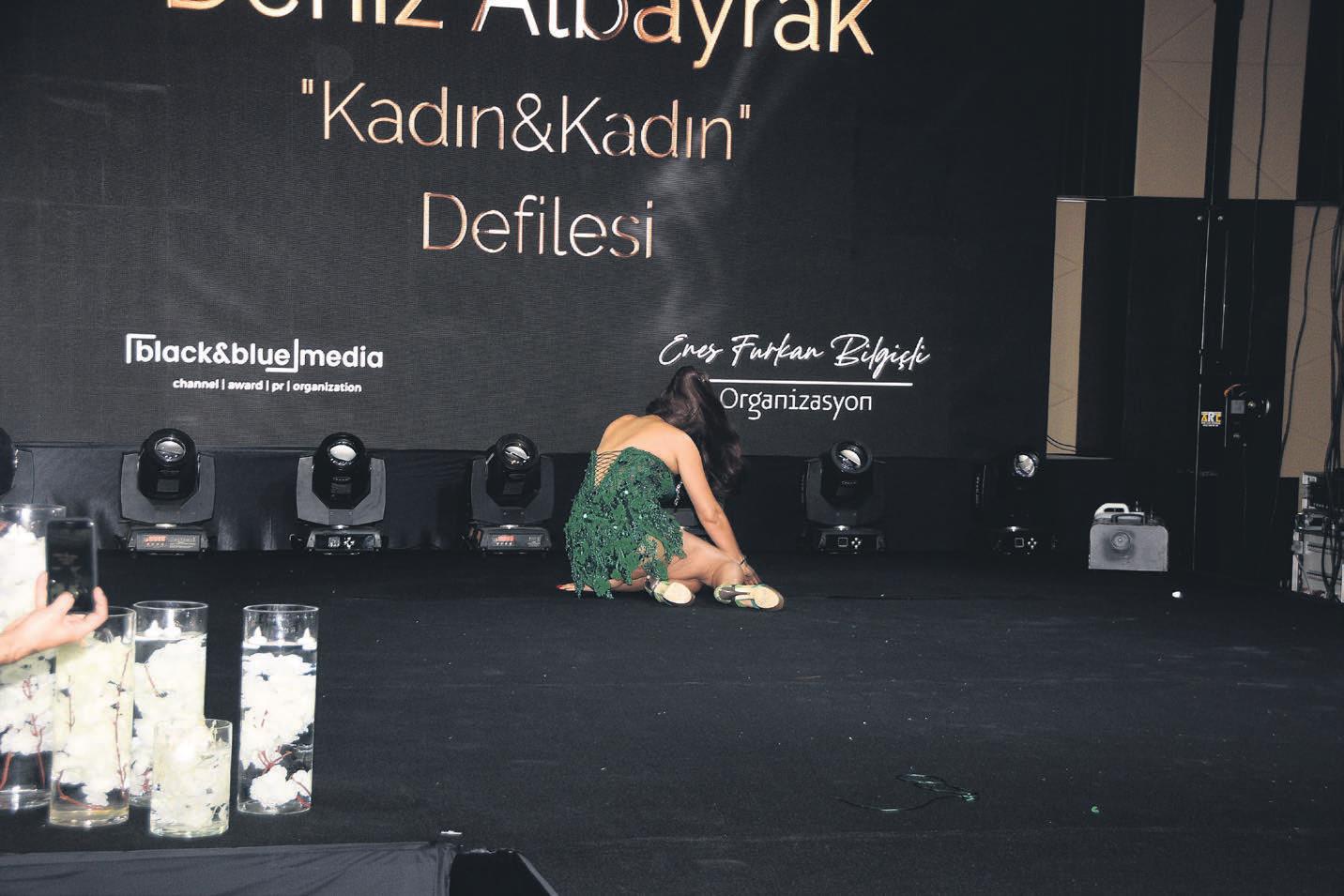 Moda tasarımcısı Deniz Albayrak, önceki akşam Sheraton Otel'de bir defile düzenledi. Defilenin baş mankeni olan Altıntop ise sahnede kaza atlattı. Yüksek topuklular yüzünden podyumda yere kapaklandı, ayakkabılarını çıkartıp attı.
