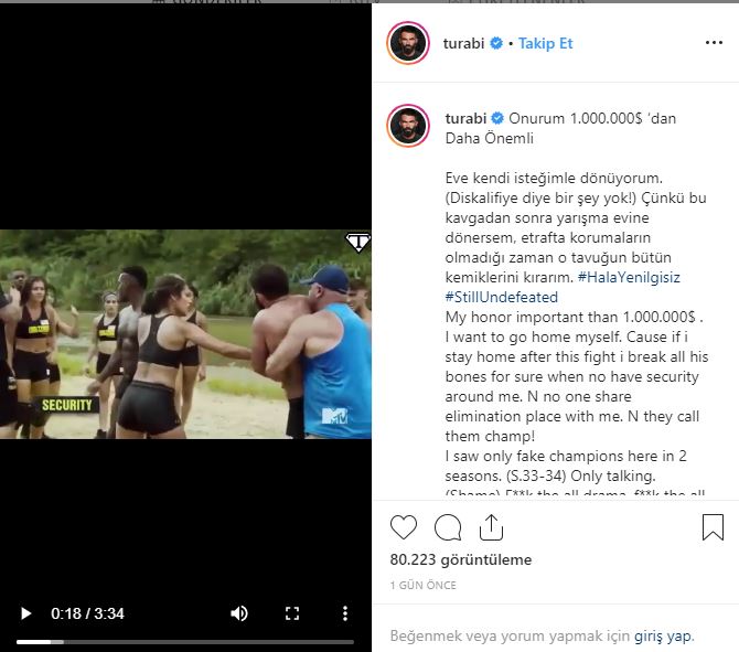 Adrenalinin bir an olsun düşmediği yarışmada rakibi ile tartışan Turabi fiziki müdahalede bulundu. Araya arkadaşlarının girmesiyle ayrılan Turabi, bir türlü sakinleştirilemedi. Görevlilerin de müdahil olduğu olayın ardından yarışmacılar evlerine döndü. Yarışma evinde de Turabi Çamkıran'ın siniri geçmedi.