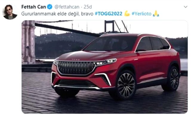 Diriliş Ertuğrul ve Kuruluş Osman'ın yapımcısı Mehmet Bozdağ ise, yerli otomobile ilişkin paylaşımında, "Türkiye'nin Otomobili hayırlı olsun. Bu gururu bizlere yaşatan Cumhurbaşkanımız Sayın Recep Tayyip Erdoğan'a Bakanımız Mustafa Varank'a ve emeği geçenlere sonsuz teşekkürler" dedi