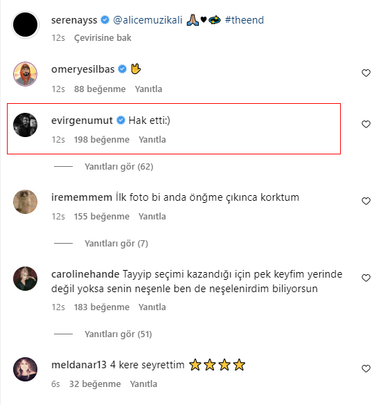Alice Müzikali'nin veda gecesinden fotoğraflarını yayınlayan Sarıkaya'ya eski sevgilisi Umut Evirgen'den gelen beğeni dikkat çekerken ilk yorum da yine Evirgen'in oldu.