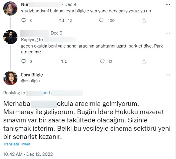 Esra Bilgiç, bu konuşmayı görünce dayanamayıp cevap verdi. "Merhaba, okula aracımla gelmiyorum. Marmaray ile geliyorum. "