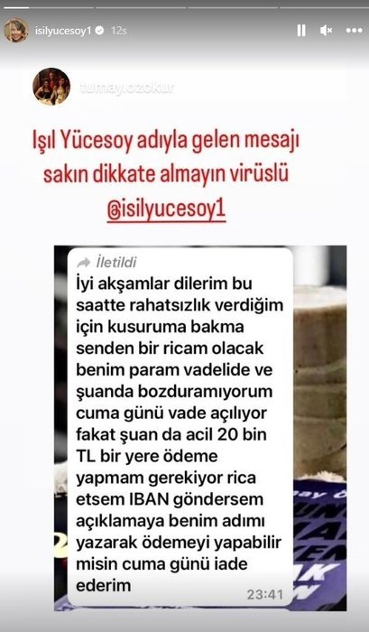 Usta oyuncu Işıl Yücesoy'un telefon rehberindeki bazı isimlere, "İyi akşamlar dilerim. Bu saatte rahatsızlık verdiğim için kusura bakma. Senden bir ricam olacak. Benim para vadelide ve şu an bozduramıyorum. Cuma günü vade açılıyor. Fakat şu anda acil 20 bin TL bir yere ödeme yapmam gerekiyor.