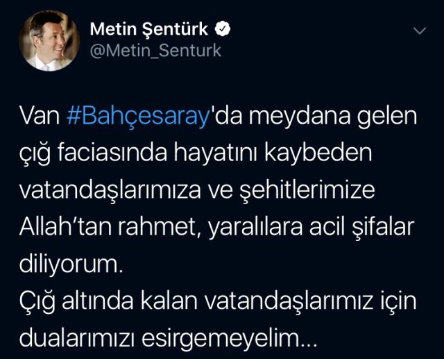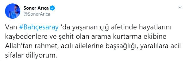 Van- Bahçesaray karayolunda yaşanan çığ felaketinde hayatını kaybeden 39 kişi tüm Türkiye'yi yasa boğdu. Çığ altında kalan vatandaşları kurtarma çalışmaları devam ederken ünlü isimlerden de art arda başsağlığı mesajları geldi.