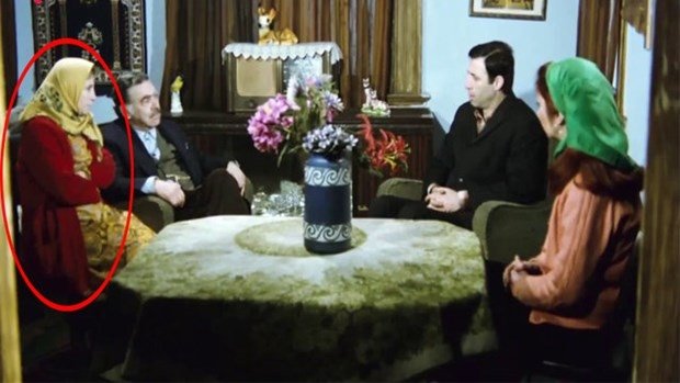 Türkan Şoray ve Bulut Aras'ın başrolünü oynadığı 1978 yapımı filmde Adile Naşit'in olmayan başörtüsü sahne açısı değişince birden başında görülüyor.