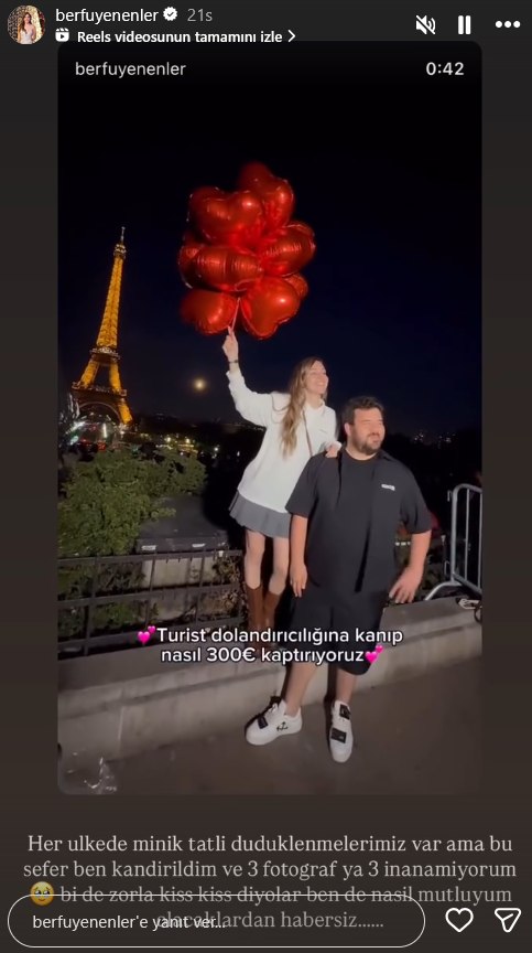 Ünlü sunucu ve komedyen Eser Yenenler, eşi Berfu Yenenler ile birlikte evlilik yıl dönümlerini kutlamak için Paris'e gitti. Ancak romantik tatil kısa sürede tatsız bir olaya sahne oldu. Çift, Paris sokaklarında fotoğraflarını çekmek isteyen kişiler tarafından dolandırıldıklarını açıkladı.