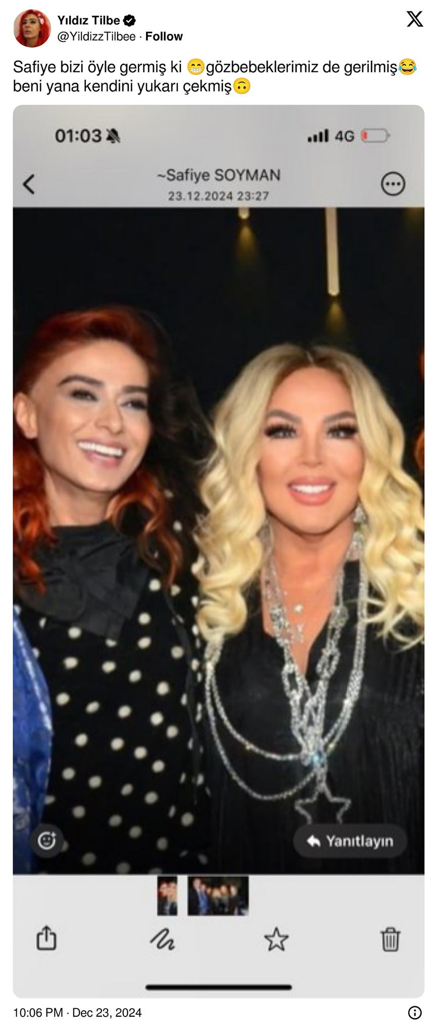 Instagram'dan yayınladığı filtreli fotoğraflarıyla zaman zaman ti'ye alınan Safiye Soyman, son paylaşımıyla gündem oldu. Seda Sayan'dan sonra Soyman'ın 'gençlik' filtresinden nasibini alan son isim ise Yıldız Tilbe oldu! Tanınmayacak hale gelen Yıldız Tilbe "Safiye bizi öyle germiş ki…" şeklinde esprili bir yorumda bulundu.