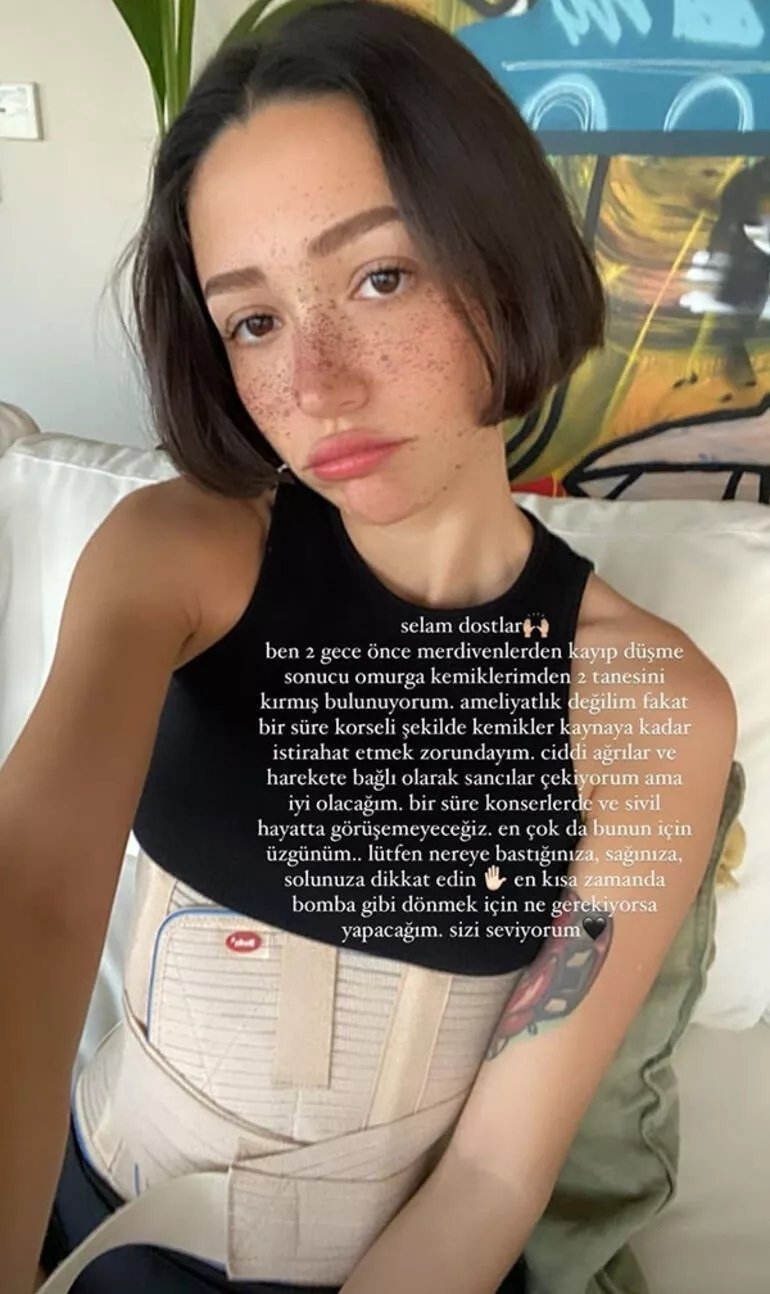 "Selam dostlar. Ben iki gece önce merdivenlerden kayıp düşme sonucu omurga kemiklerimden iki tanesini kırmış bulunuyorum. Ameliyatlık değilim fakat bir süre korseli şekilde kemikler kaynayana kadar istirahat etmek zorundayım. Ciddi ağrılar ve harekete bağlı sancılar çekiyorum ama iyi olacağım. Bir süre konserlerde ve sivil hayatta görüşemeyeceğiz. En çok da bunun için üzgünüm... Lütfen nereye bastığınıza, sağınıza, solunuza dikkat edin. En kısa zamanda bomba gibi dönmek için ne gerekiyorsa yapacağım. Sizi seviyorum"
