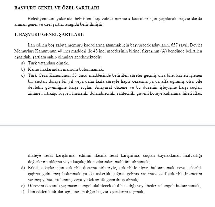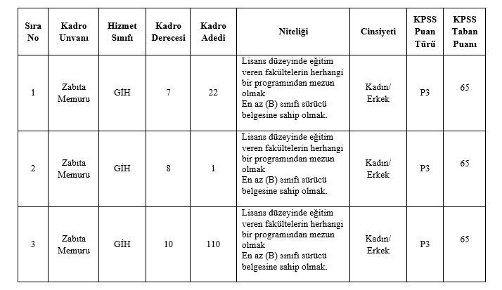 Zabıta memuru kadroları için başvuruda bulunacak adayların taşıması gereken şartlar şu şekilde sıralanıyor: