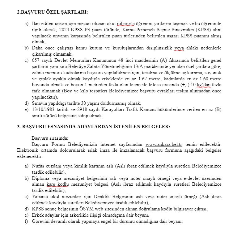Ankara Büyükşehir Belediyesi tarafından yapılan duyuruya göre, en az 65 KPSS puanı ve belirlenen şartları karşılayan adaylar arasından toplamda 133 zabıta memuru alınacak. Başvuru yapmak isteyen adayların, belirlenen başvuru tarihleri ve koşulları dikkatlice incelemeleri gerekiyor.