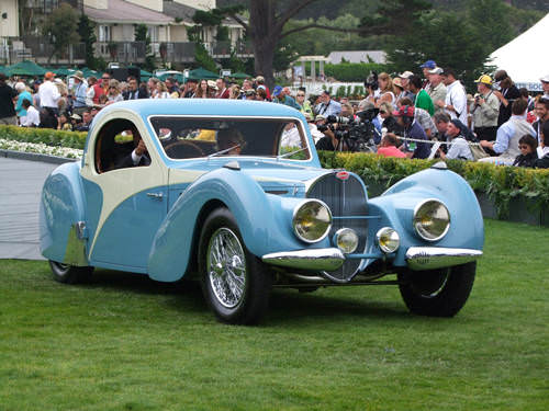 İtalyan mühendis Ettore Bugatti tarafından tasarlanan otomobillerde hafif kasa, büyük motor ve egzotik şekiller kullanıldı. 12,7 litrelik düz 8 silindir motora sahip olan otomobilin dingil aralığı 4,6 metreden fazlaydı.