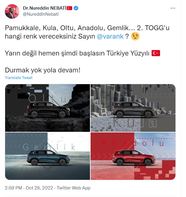 Nebati, Sanayi ve Teknoloji Bakanı Mustafa Varank'ı da etiketlediği paylaşımında "Pamukkale, Kula, Oltu, Anadolu, Gemlik... 2. TOGG'u hangi renk vereceksiniz Sayın Varank? Yarın değil hemen şimdi başlasın Türkiye Yüzyılı. Durmak yok yola devam!" ifadelerini kullandı.