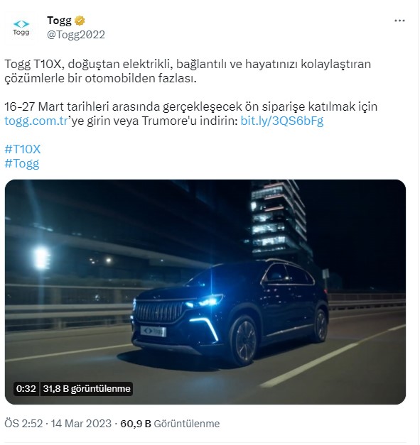 Togg sosyal medya hesabından yapılan açıklamada, Trumore uygulaması ile ön sipariş verme hakkı sunuluyor.
