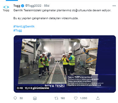 TOGG, "Gemlik tesisimizdeki çalışmalar planlarımız doğrultusunda ilerliyor." mesajını paylaştı ve son durumu aktardı.