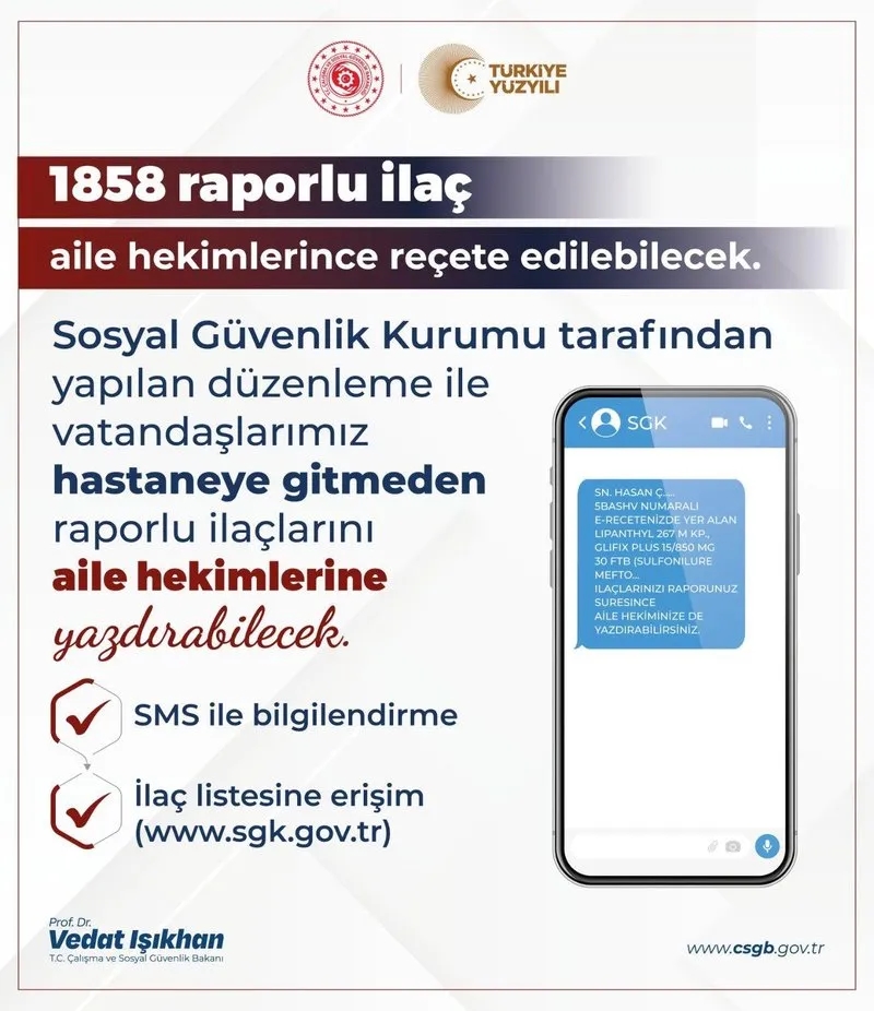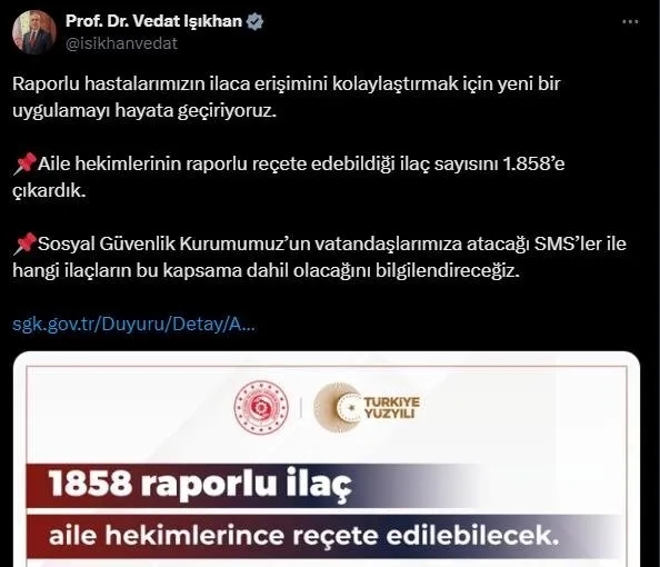Işıkhan, sosyal medya hesabından yaptığı açıklamada, şu ifadeleri kullandı: "Raporlu hastalarımızın ilaca erişimini kolaylaştırmak için yeni bir uygulamayı hayata geçiriyoruz. Aile hekimlerinin raporlu reçete edebildiği ilaç sayısını 1858'e çıkardık. Sosyal Güvenlik Kurumumuzun vatandaşlarımıza atacağı SMS'ler ile hangi ilaçların bu kapsama dahil olacağını bilgilendireceğiz."