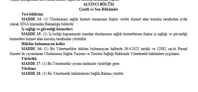 Sağlık Bakanlığı, Türkiye'nin uluslararası sağlık turizminde rekabet gücünü artırmak için "Uluslararası Sağlık Hizmetlerinde İş Birliği Yönetmeliği"ni yürürlüğe koydu. Resmi Gazete'de yayımlanan yönetmelik, Bakanlık ve üniversite hastaneleri arasındaki iş birliğini yeniden düzenleyerek, nitelikli sağlık personeli ve kaynakların etkin kullanımını amaçlıyor.