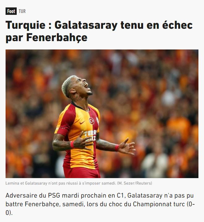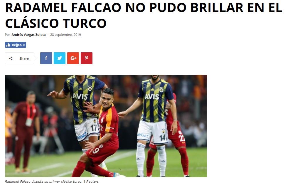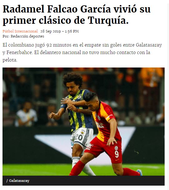 (Kolombiya) Futbolred: "Falcao'nun Galatasaray'la ilk derbisinde kötü oyun" başlığı ile duyurulan haberde Falcao'nun 93 dakika süre aldığı ancak gol atamadığı ifade edildi.