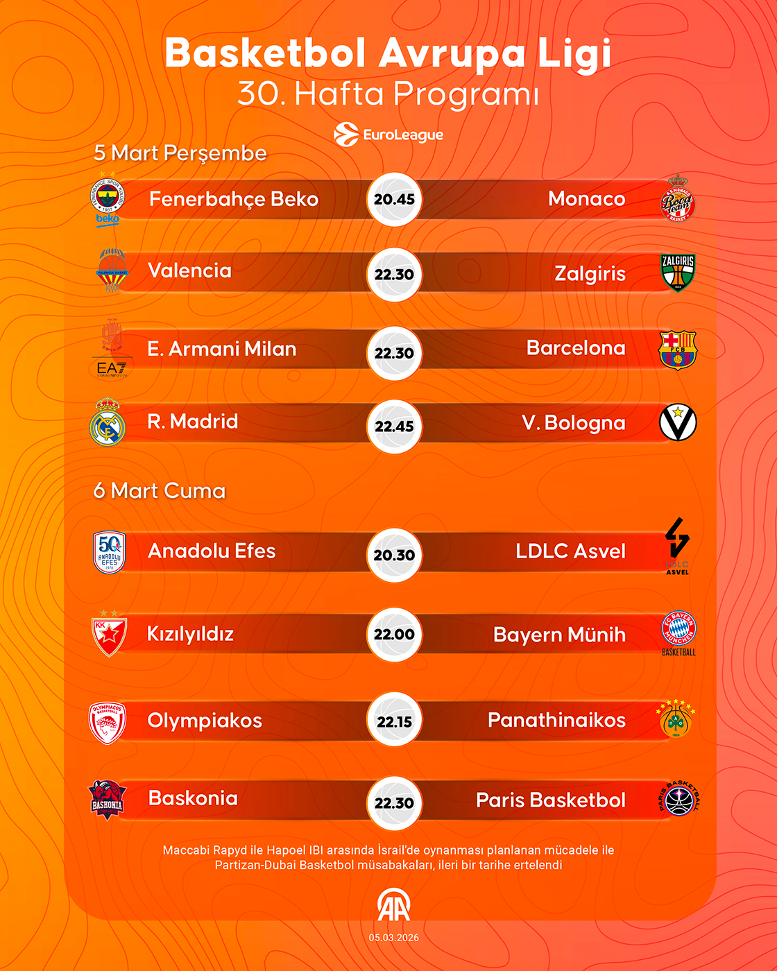 Basketbol Avrupa Ligi’nde 30. hafta heyecanı: 5-6 Mart EuroLeague maç programı