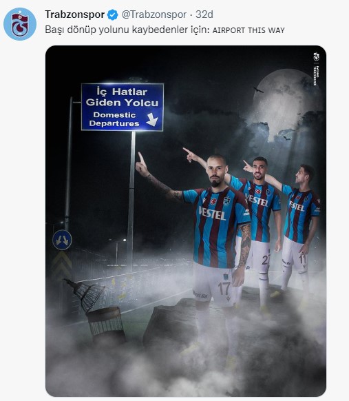 Fenerbahçe'nin evine geri dönüş biletini kesen Trabzonspor'dan gelen manidar mizansende "Başı dönüp yolunu kaybedenler için: ᴀɪʀᴘᴏʀᴛ ᴛʜɪꜱ ᴡᴀʏ" cümlelerine yer verildi.
