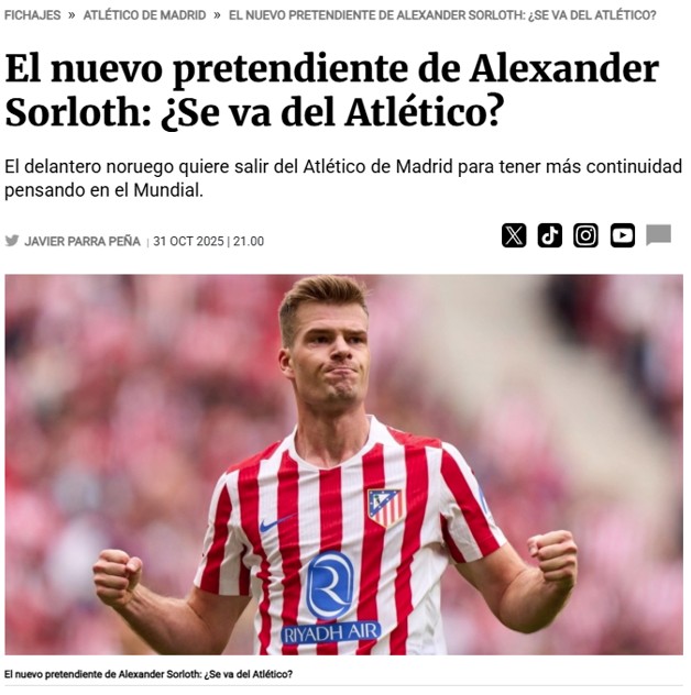 Haberin devamında kış transfer döneminin Sörloth için bir fırsat olabileceği yazılırken, Premier Lig'den Newcastle United'ın Norveçli futbolcuyu kadrosuna katmak için en büyük aday olarak gözüktüğü belirtildi. Atletico Madrid'in de en azından kendisinin yerine yeni bir transfer yapmak için 29 yaşındaki futbolcuyu tutmak istese de kış transferinde yaşanacak olası bir ayrılığa da kapılarını tamamen kapatmadığı yazıldı.