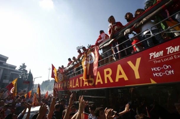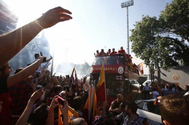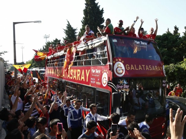 Spor Toto Süper Lig'de şampiyon olan Galatasaray, Türk Telekom Arena'da düzenlenecek olan törende kupasını almak için Florya Metin Oktay Tesisleri'nden üstü açık bir otobüs ile hareket etti.