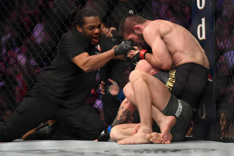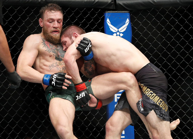 Tüm dünyanın merakla beklediği Khabib Nurmagomedov ile Conor McGregor maçını 4. raund sonunda Khabib'in zaferiyle sonuçlandı. Maçın ardından olay çıkarken görevliler tribünlere atlayan Khabib Nurmagomedov'u zorlukla sakinleştirdi.