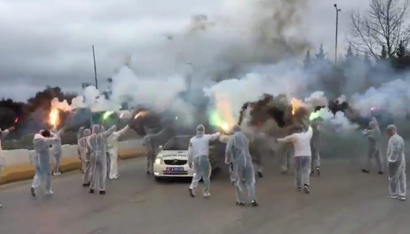 Taraftarlar koruyucu kıyafet ve maske takıp, meşalelerle Kocaelispor'u stada uğurlarlarken, görüntüler sosyal medyada büyük ilgi gördü.